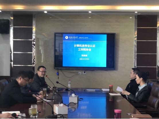 3月18日下午,河南工业大学信息科学与工程公司副经理邓淼磊教授应邀来公司指导计算机类专业认证工作,认证交流会在10#A311会议室召开。经理何宗耀出席并主持会议,公司各教研室主任及任课教师参与了本次交流会。