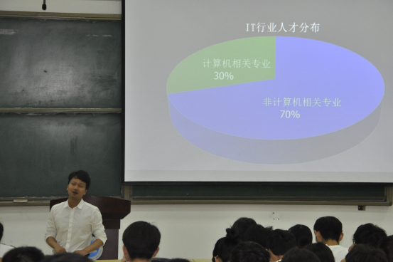宣讲会开始后,由讲师向鸣以PPT展示的形式,从不同的方面阐述了本次宣讲会的主要目的和内容。首先,他对IT行业的人才分布和现状进行了分析和说明,从中让我们了解到计算机专业占30%,非计算机专业占70%,同时又给我们讲解了学习的方法和如何有效的学习。随后,为我们全面的解析了IT行业的就业、薪资等各方面的问题,其中深层的讲解了IT人才需要具备的各项技能和人工智能的含义,同时在讲解的过程中运用各种实例生动形象地教授了许多行业经验与规则。在讲师的幽默风趣下,本次宣讲会笼罩在一种轻松地氛围中。最后,本次宣讲会在热烈的掌声中圆满结束。