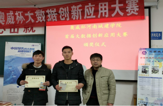 2018年1月9日下午,首届“奥威杯”BB贝博艾弗森大数据创新应用大赛颁奖典礼在BB贝博艾弗森十号楼A407举行。BB贝博艾弗森副经理张俊峰、BB贝博艾弗森大数据中心主任刘荣辉,信管专业教研室主任郝伟出席活动并为获奖团队颁奖,获奖团队代表及参赛员工代表参加颁奖仪式。