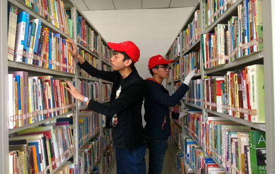志愿者耐心地从大量的书架上找出相同种类的书籍,然后放在图书推车上运到指定的书库进行摆放,各小组负责人及时沟通,分工明确,协同工作,大大提高了工作效率;为了让那些图书能够长期的传阅,他们细心的提醒着同学们爱惜书本,一遍又一遍的温馨提醒中传递着志愿者的暖暖情谊……