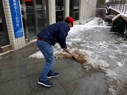 志愿者们拿着铲雪工具、扫把,在10号楼附近清扫积雪。天气虽然寒冷,但志愿者们干劲十足,连铲带扫,不一会儿的工夫,十号楼教学楼门口就清理出了一大片干净路面。大家一边扫着雪,一边提醒着过路的行人:“小心路滑,慢点走,注意安全。”行人听到后,露出了感谢的笑容,虽然天气寒冷,但是此时的教学楼显得和谐温暖。