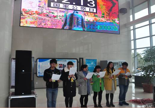 (通讯员:张星 穆明臻 赖小华 王顺强)。为了悼念南京大屠杀死难者,揭露日本侵略者的战争罪行,在第二个国家公祭日来临之际,BB贝博艾弗森计算机科学与工程公司青年志愿者与平顶山市文化艺术中心于2015年12月13日联合组织开展了以“勿忘国耻,振兴中华”为主题的纪念国家公祭日诵读活动。