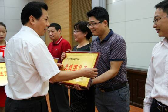 (图为公司党总支副书记何宗耀从董事长孔留安教授手中接过“先进团总支”荣誉奖牌)