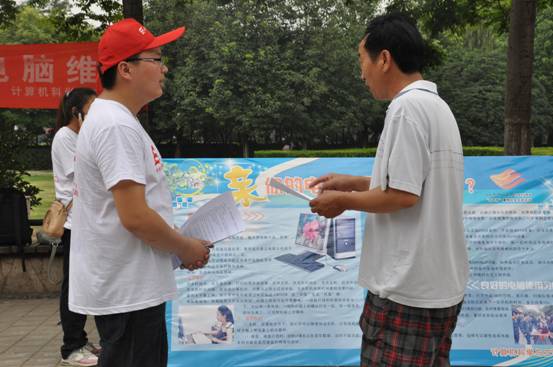 通过前些天的问卷调查和维修实践,志愿者们深刻的感受到了进社区进行计算机知识普及,维修的必要,活动进行到最后一天,志愿者们依然饱含激情,积极参与。通过前几天的宣传,今天来现场咨询的人明显变多,另外需要到家里维修电脑的也明显变多,志愿者们都有些忙不过来了。知识宣讲小组仍然在发放宣传手册并且耐心的讲解计算机使用常识。资料收集整理小组,在不停的汇总调查问卷的内容并进行信息提取。志愿者们虽然都忙的热火朝天,但是各方面都进行得井井有条。