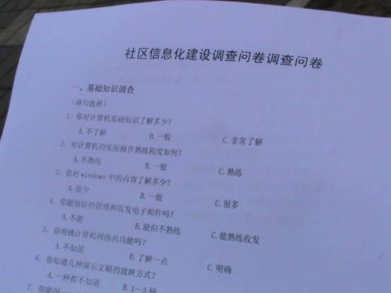 到达地点后,同学遵循事前安排的工作计划,分头行动,以两三人的为一小组,对社区的居民以及路经的行人,司机分别进行问卷调查。绝大多数的人对本次计算机问卷调查活动表示了积极配合和支持,也有一小部分排斥,不愿配合的人,同学们也能积极与其沟通,宽容对待,一笑而过,并真挚接受一些好的建议和意见。活动举行得愈来愈顺利,同学们也由原本的一些羞涩变得更为大方而耐心。居民们对队员所搜集的问题都尽己所能做了令人满意的回答,队员们态度友善,居民们和蔼和亲,使问卷调查工作的效率得到大幅度的提升,使得活动能够高效地进行,圆满地结束。