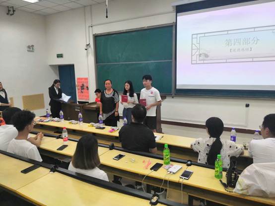 随后,2018年度优秀辅导员刘恋老师结合卢永根院士的动人事迹,做了分享感悟,激励同学们谨记使命,认真学习,有所作为。活动中场是才艺展示,艺术团的同学齐唱歌曲《光阴的故事》,引来阵阵掌声。紧接着是员工代表的故事分享,两名员工为大家分享了其记忆深刻的老师的故事,大家被深深吸引,不觉送上感动的掌声。公司党总支副书记张星为两位同学颁奖并合影留念。