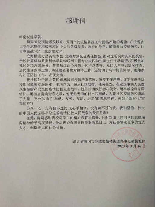 (通讯员 周岸)近日,公司学子阳世伟收到一封来自共青团麻城市委和麻城市志愿者协会的感谢信,与此同时,公司收到一封来自湖北省黄冈市麻城市鼓楼街道办事处鼓楼社区的感谢信,对阳世伟疫情期间踊跃参与疫情防控、积极参加社区各项志愿服务表达由衷的感谢和崇高的敬意。