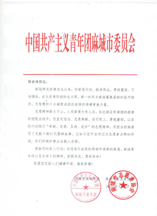 共青团麻城市委和麻城市志愿者协会给阳世伟的感谢信