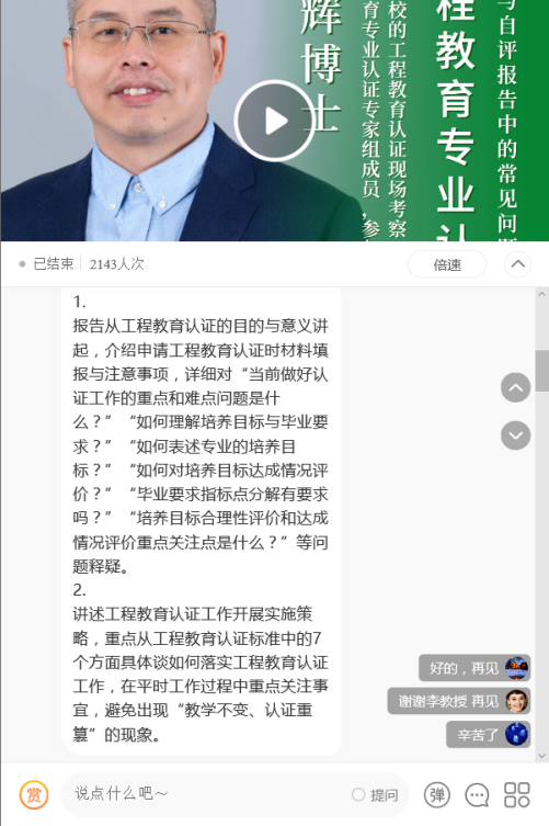 3月29日晚19:30起,卓越国培公益邀请工程认证专家组成员李辉博士针对《工程教育专业认证》内涵进行线上解读,公司组织全体教研室主任参加会议。直播讲座围绕认证认识、准备申请、实施策略、常见疑虑、具体落实等话题展开。