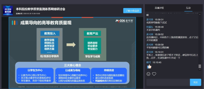 3月26日下午,麦可思研究院召开了《本科院校教学质量监测体系网络研讨会》,因名额有限,部分教研室主任参加了会议。会议围绕教学质量监测的途径和手段、如何从教学质量数据中识别教学改进措施、教学质量监测助力专业认证数据举证等等内容展开解读。