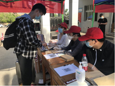 7点,返校复学的员工开始陆续报道。经过个人消杀、体温检测、人脸识别等层层“关卡”,员工来到报到处,将承诺书、有车票信息的信封交给辅导员,并领取返校复学礼包,随后,便可以前往寝室入住。整个报道流程分工细致,各项工作开展井然有序。