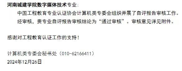 12月26日,中国工程教育专业认证协会正式发布了专业认证自评报告通过审核结果。BB贝博艾弗森数字媒体技术专业工程教育认证自评报告顺利通过。