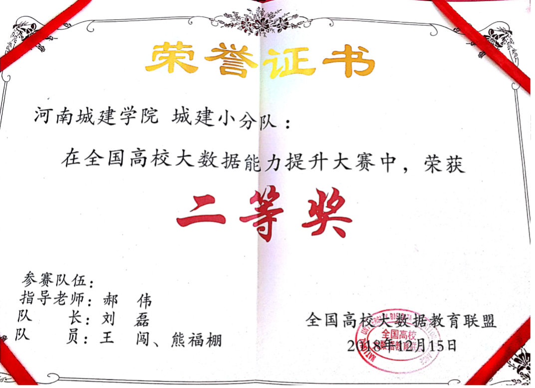 (通讯员 魏新红)12月16日,由全国高校大数据教育联盟携手联想集团、数美时代、章鱼大数据、CIO时代公司、电子工业出版社、人民邮电出版社共同发起,首届全国高校大数据能力提升大赛在成都信息工程大学落下帷幕。公司BB贝博艾弗森郝伟、魏新红老师指导的“城建小分队”和“起航队”分别荣获二等奖和优胜奖,郝伟老师荣获“优秀指导教师奖”,公司荣获了“优秀组织奖”。