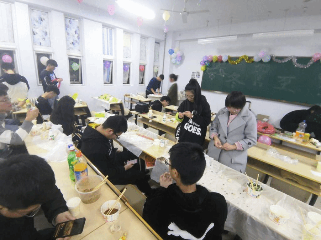 活动前,各班同学发挥想象力装饰自习室,并积极准备各项活动所需材料。接着,在各班班委的组织下,各班同学纷纷撸起袖子,投入“包饺子”工作中。调酱料、揉面团、擀皮、包馅、煮饺子,大家热情高涨、积极参与,分工协作,配合默契。同学们一边包饺子,一边交谈,教室里不时传出阵阵笑声。经过两个多小时的忙碌,一只只形态各异、别具一格的饺子摆满了盘子,“大厨”们可谓是将想象力与创造力发挥到了极致。最后,一盘盘热气腾腾的饺子纷纷出炉,大家一边品尝自己的劳动成果,一边欣赏同学们的才艺表演,浓浓饺子香使人忘却了冬日的寒冷。