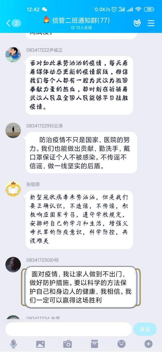 在党中央的坚强领导和社会各界的努力下,新型冠状病毒患者治愈率有所提高,新增病例大大降低。作为当代老员工,我们更有责任、有义务重视疫情,熟知相关防控知识。现在,同学们虽各处一方,但都在做着同样一件事情——认真地观看新冠病毒防控知识。在老师及班委的指导下,同学们都非常重视这次授课,认真观看视频的每一部分,对居家期间、返程期间、在校期间的个人防护,口罩的佩戴、消毒,饮食健康,心理调节等内容重点关注,结合自身情况学以致用。