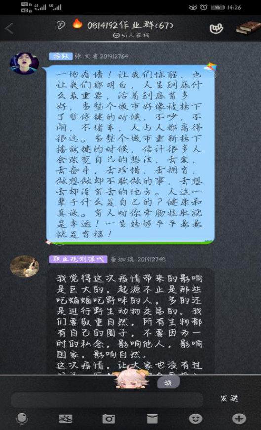 此次防疫主题线上会议由各班团支书主持。活动开始,各班团支书组织同学们观看疫情相关新闻,借助视频讲解疫情的相关情况,并提出防疫倡导,引导同学们在家做好防疫工作。接着,团支书呼吁大家发表自己的意见,同学们积极参与,热烈讨论,踊跃发表自己的意见。活动最后,团支书进行简要总结并督促同学们上交会后反思。