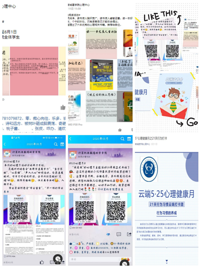 本次系列活动涵盖了“云端电台”、“21天行为习惯云端打卡团”、“我爱我的故乡”摄影作品大赛、“云端心理咨询”、“愿定漂流瓶”、“灵魂对对碰”、“毕业云寄语”、“心理云班会”等活动,从前期的高度重视、积极宣传,到活动过程中的积极参与、有效组织,再到后期的认真总结,公司师生合力推动系列活动的参与开展,借助本次活动进一步了解和掌握员工的心理健康状况,加强员工的心理健康教育工作。