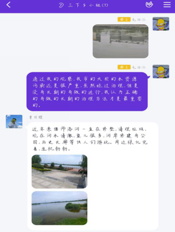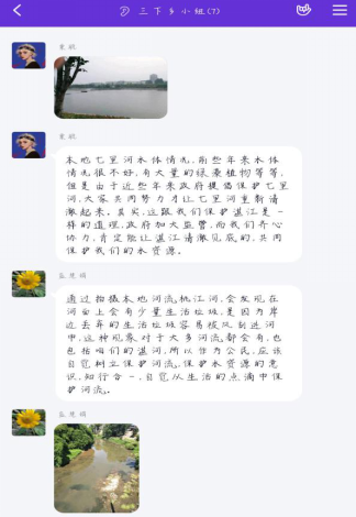 7月14日上午,“保护母亲河,传播绿色环保理念”服务团于10点准时进行实地勘察,拍照活动。志愿者们各自在当地前往河流附近了解情况,分别有七里河,桃江河,虞城县河流,周口市护城河,偃师市洛河。大部分地区河水清澈,周边景观绿化完善,且修有公园,文化长廊供人们游玩。随后,成员们在组内进行了讨论交流,各自分享当地河流的优美照片。
