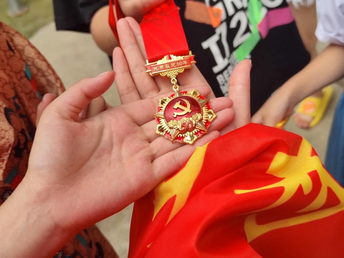 图为老党员李芳欣爷爷向实践队员们展示“光荣在党50年”纪念章