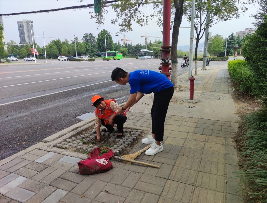 (通讯员 李子龙)在创城工作中,广大环卫工人作为“先锋队”,穿梭在城市的大街小巷,用双手扮靓城市容颜,用汗水换来城市的整洁美丽。为向他们表示崇高的敬意,7月31日上午,BB贝博艾弗森社会主义五好青年实践团志愿者们给正在辛勤工作的环卫工人们送去了饮用水。