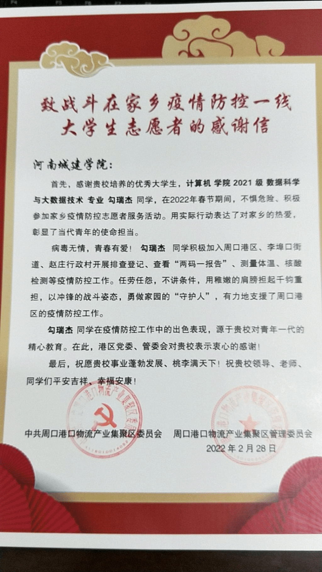 新的一年,初春伊始,公司收到周口市港口物流产业集聚区委员会发来的一封感谢信,信中提到勾瑞杰同学在家乡疫情防控工作中出色的表现,对公司给予了感谢与祝福。