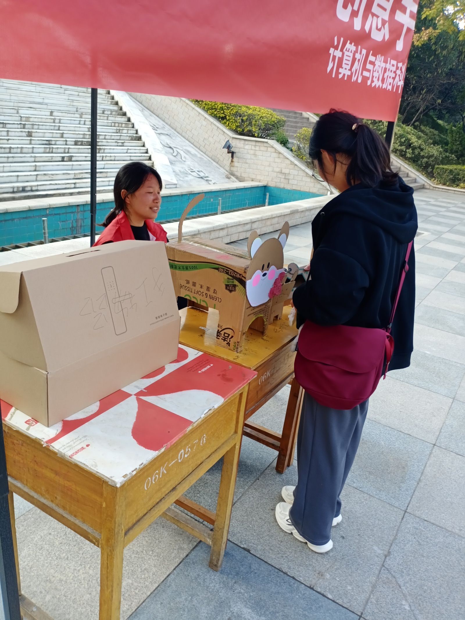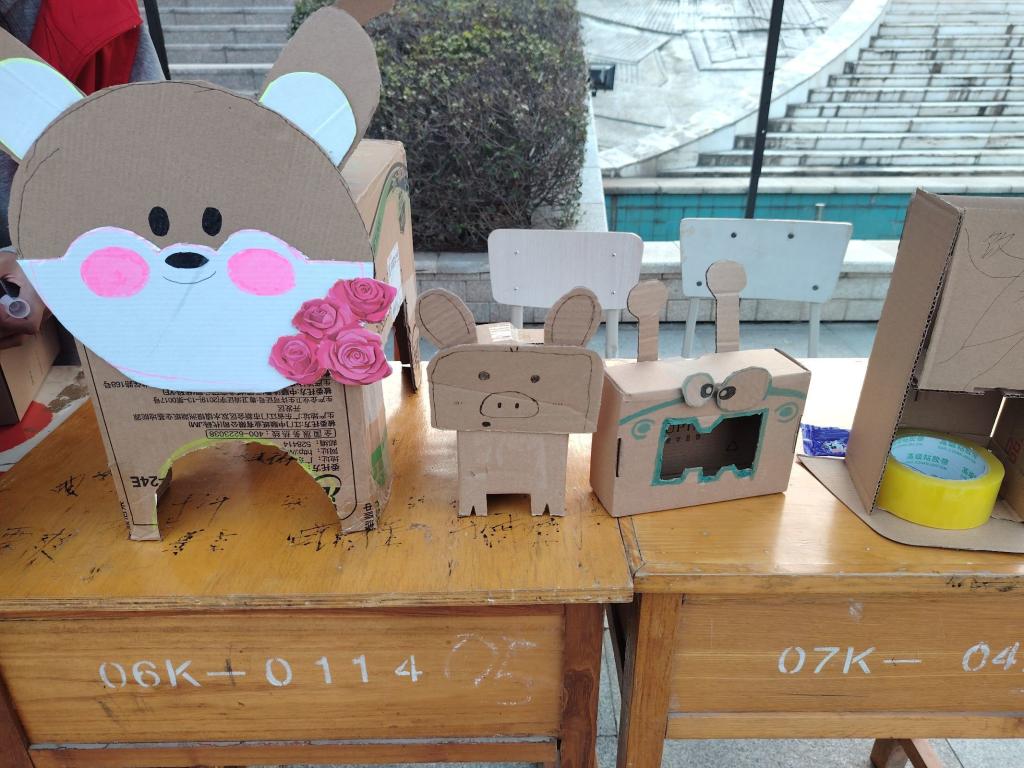 活动期间,志愿者们拿着自己提前一天做好的作品来到城建大道帐篷下展览,热情细心的宣传环保手工的想法并积极与同学们交流制作过程与灵感,鼓励同学们也加入到变废为宝,创意手工的队伍中来。