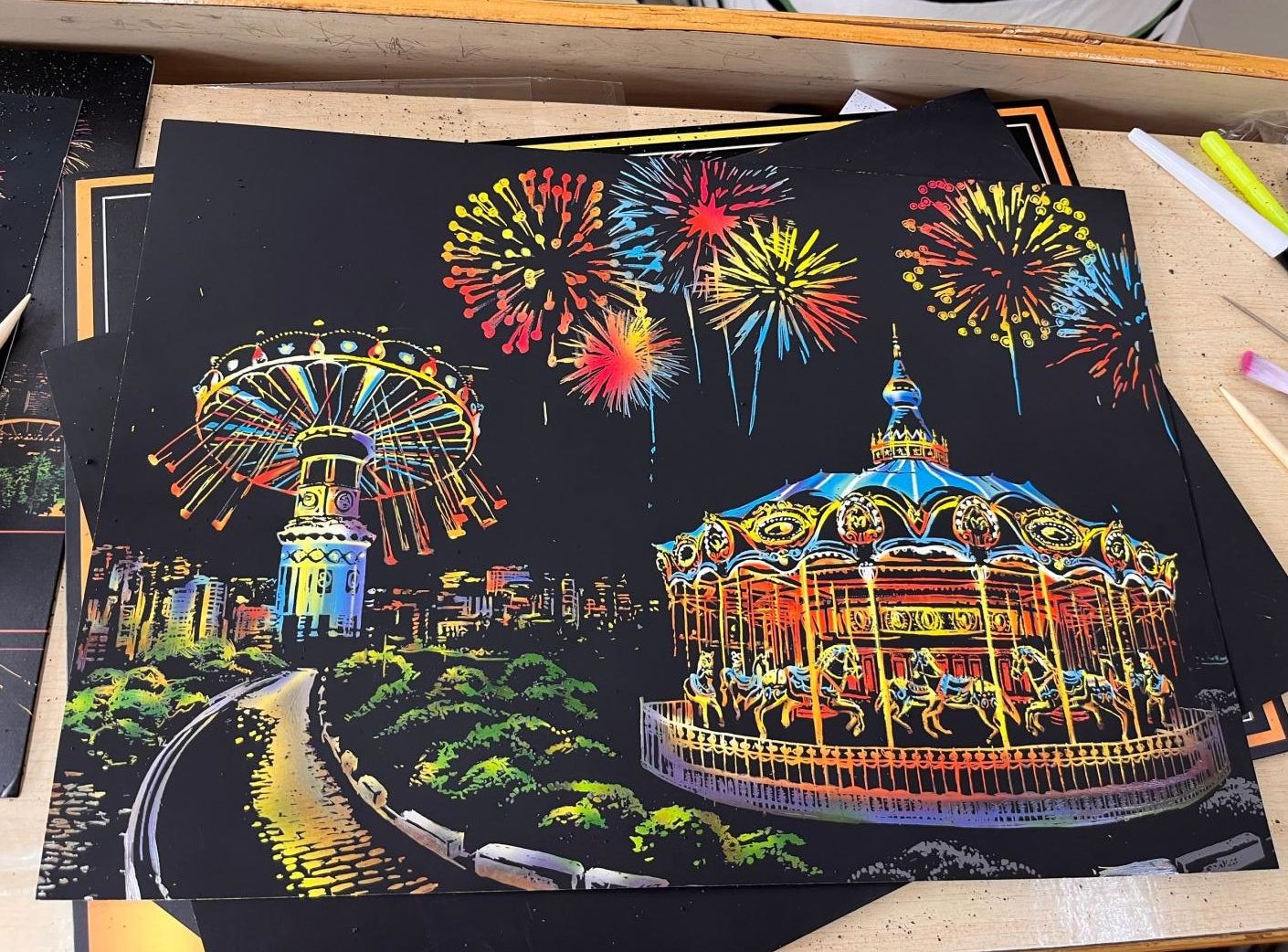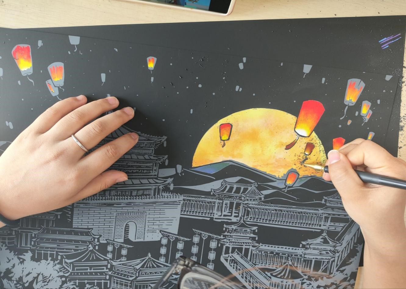 活动采取接龙的方式进行报名,志愿者们准备了20个刮刮画及其配套工具。在介绍了刮刮画的基本步骤和注意事项以后,同学们纷纷拿起画笔,在刮刮画上尽情挥洒创意。有的作品色彩鲜艳、充满活力,有的则线条流畅、意境深远。每一幅作品都凝聚了参与者的心血和热情,展现了他们独特的艺术才华和审美观念。此次活动不仅仅是一次创作体验,更是一种灵魂的疗愈旅程,让同学们可以静心感受身边的美好。